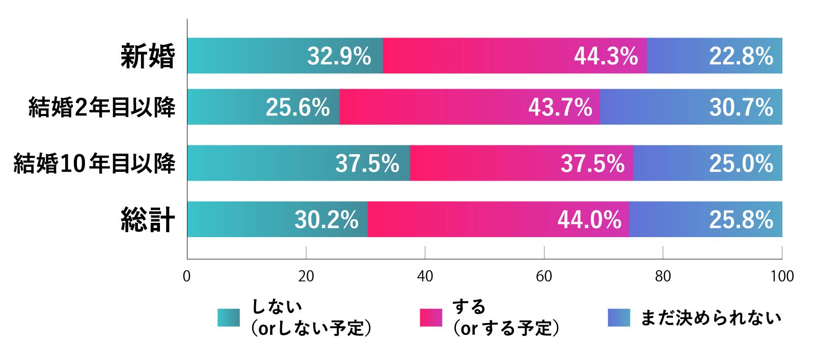 結婚10年目以降の方は37.5%の方が「決まっている」という回答をされており、帰省など毎年の過ごし方が決まっているのかもしれませんね。
