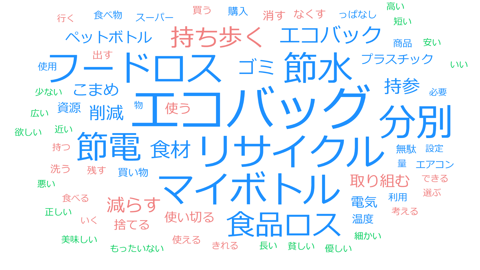 「エコバッグを使ったり、賞味期限が長い棚の後の商品を取るのではなく消費できる範囲で前のものから取ったりしています」